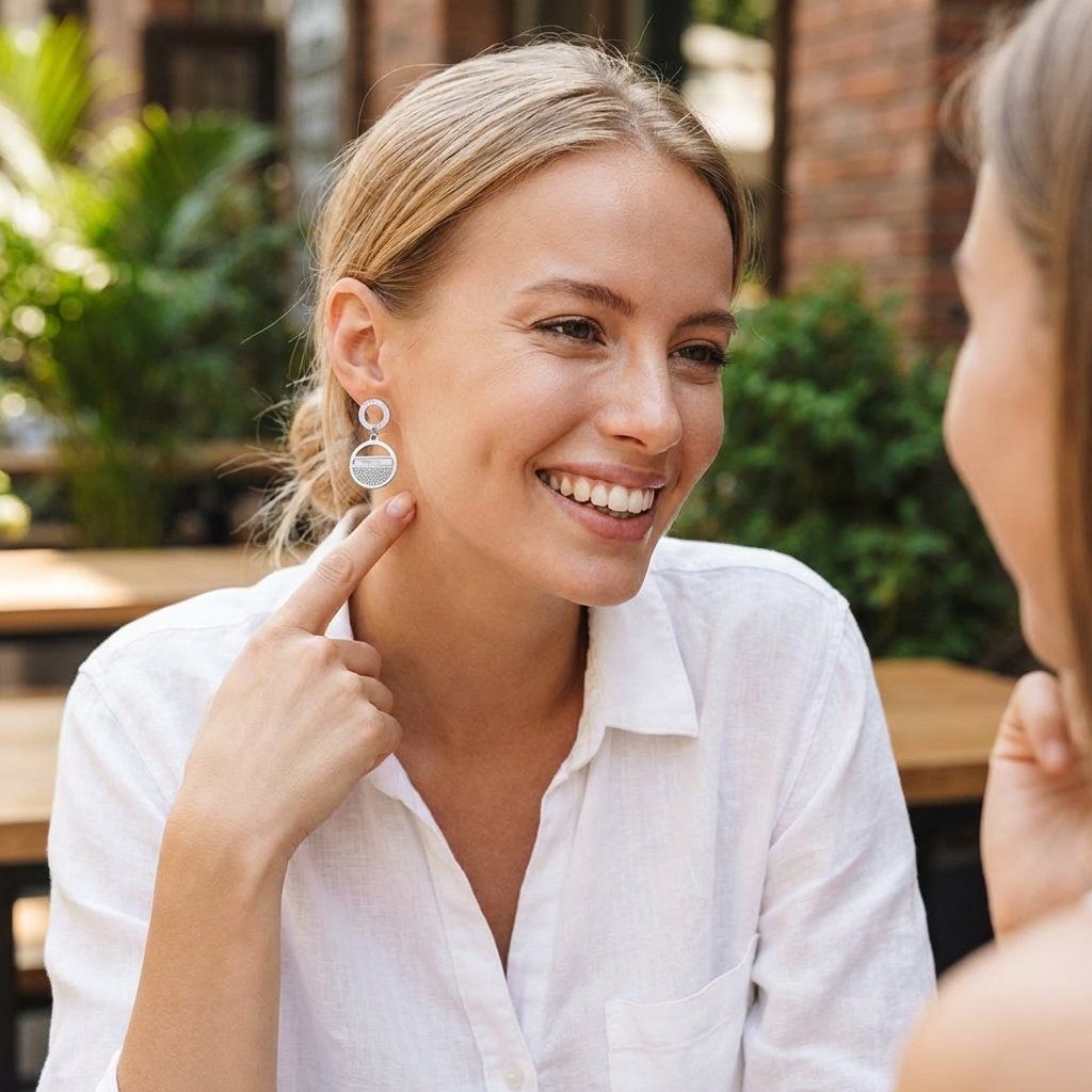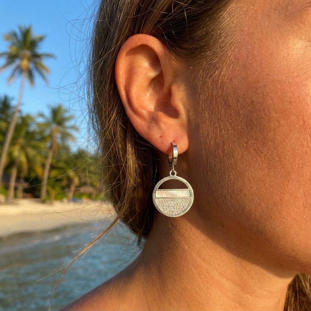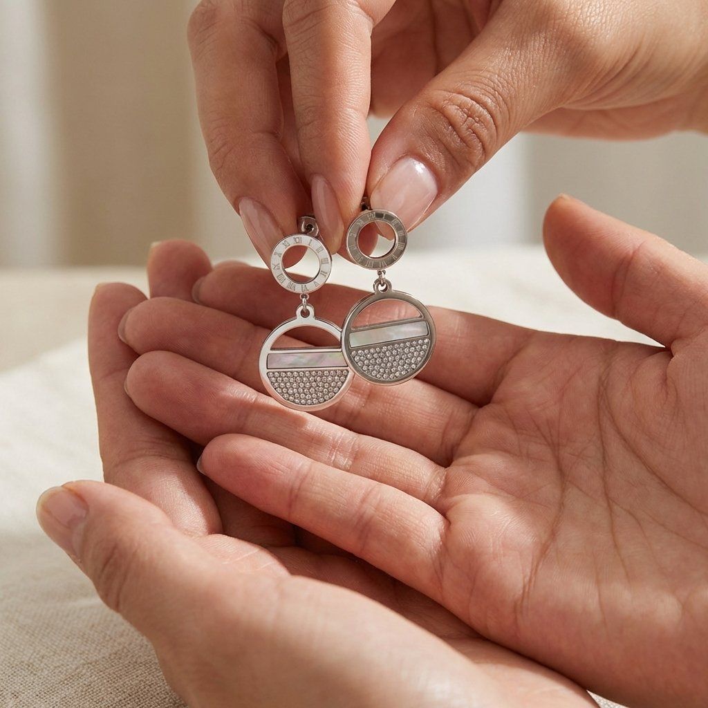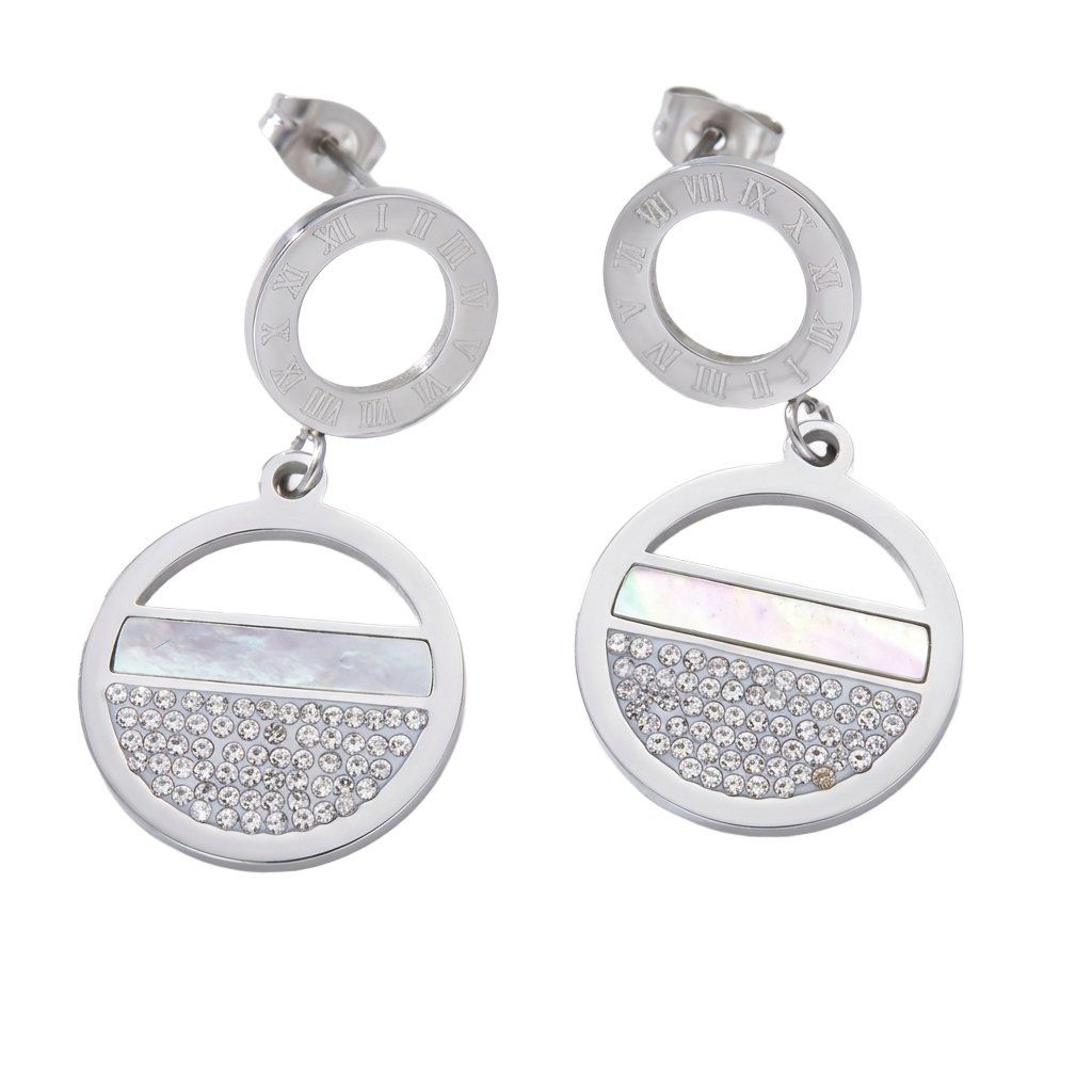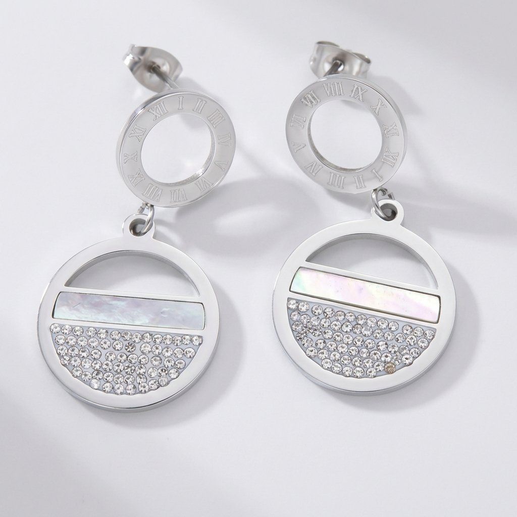 Náušnice chirurgická ocel. Chirurgická ocel je oblíbeným kovem, který nezpůsobuje alergie. Proto se z něj vyrábí mnoho módních doplňků a šperků. Vhodné pro děti i dospělé. Rozměr vnější průměr kroužku s kamínky 19 mm, středem kroužku vede perleťový proužek, vnější průměr kroužku s římskou číselnici jako na hodinách 13 mm. PIN jehla 1 cm. Náušnice mají ocelové papínaní + silikonovou pojistkou. Náušnice zdobené zirkony. Dárkové balení.