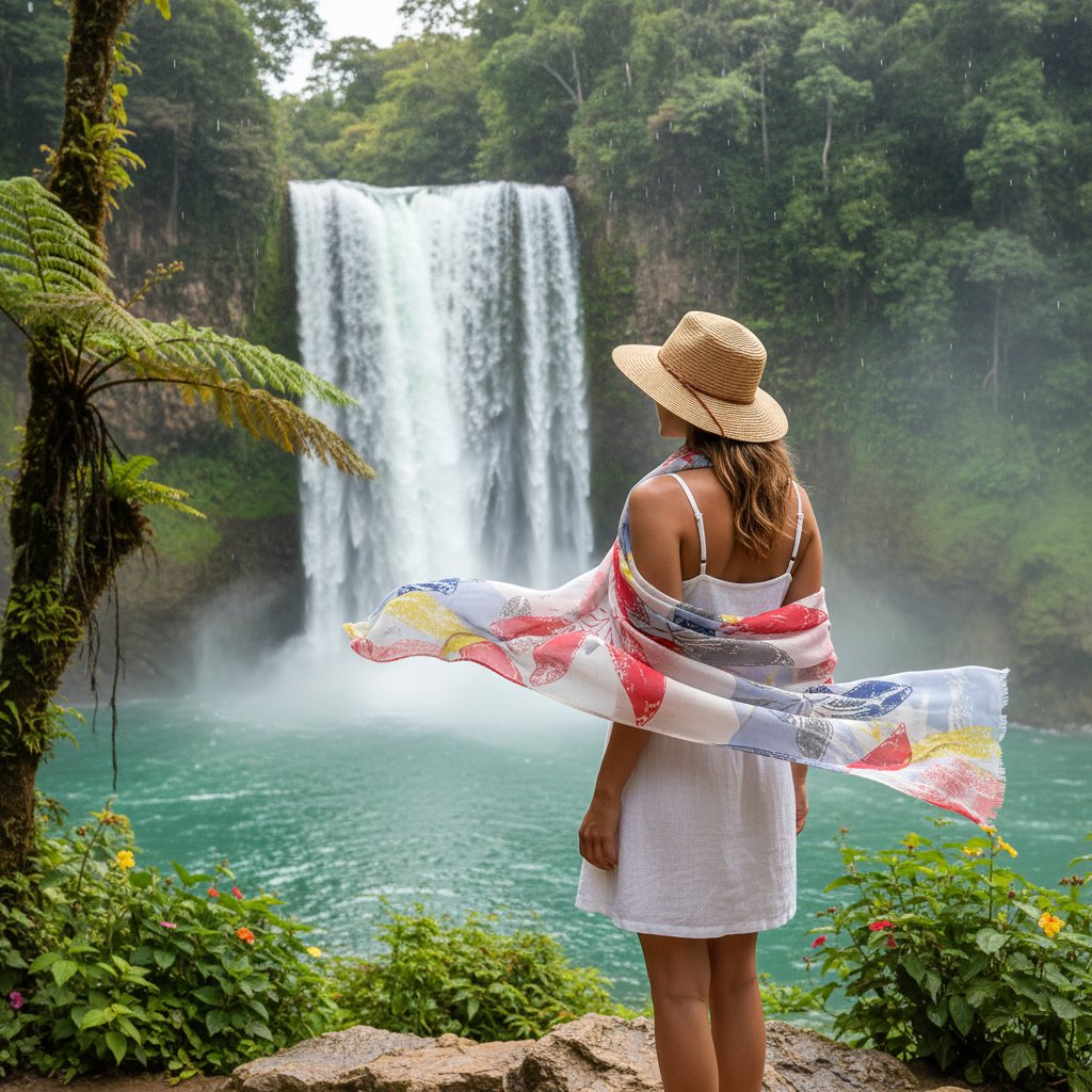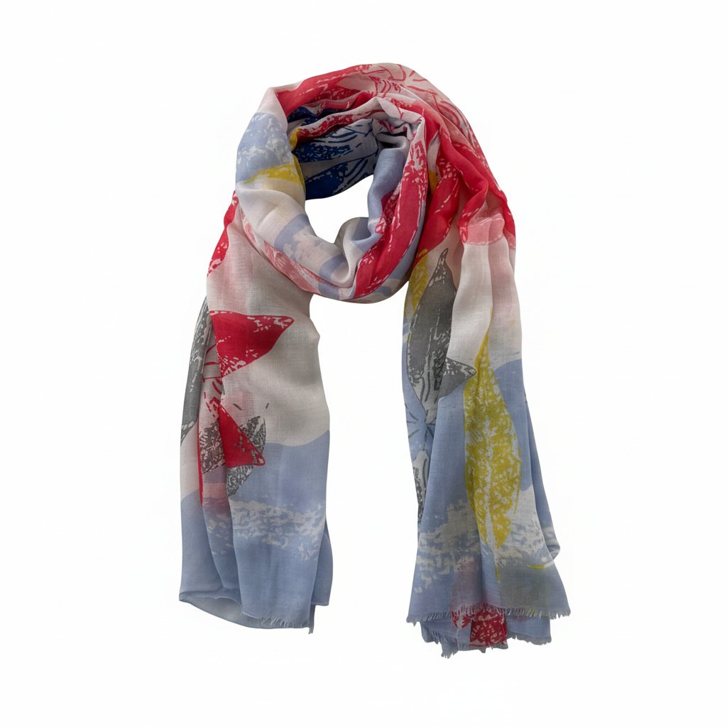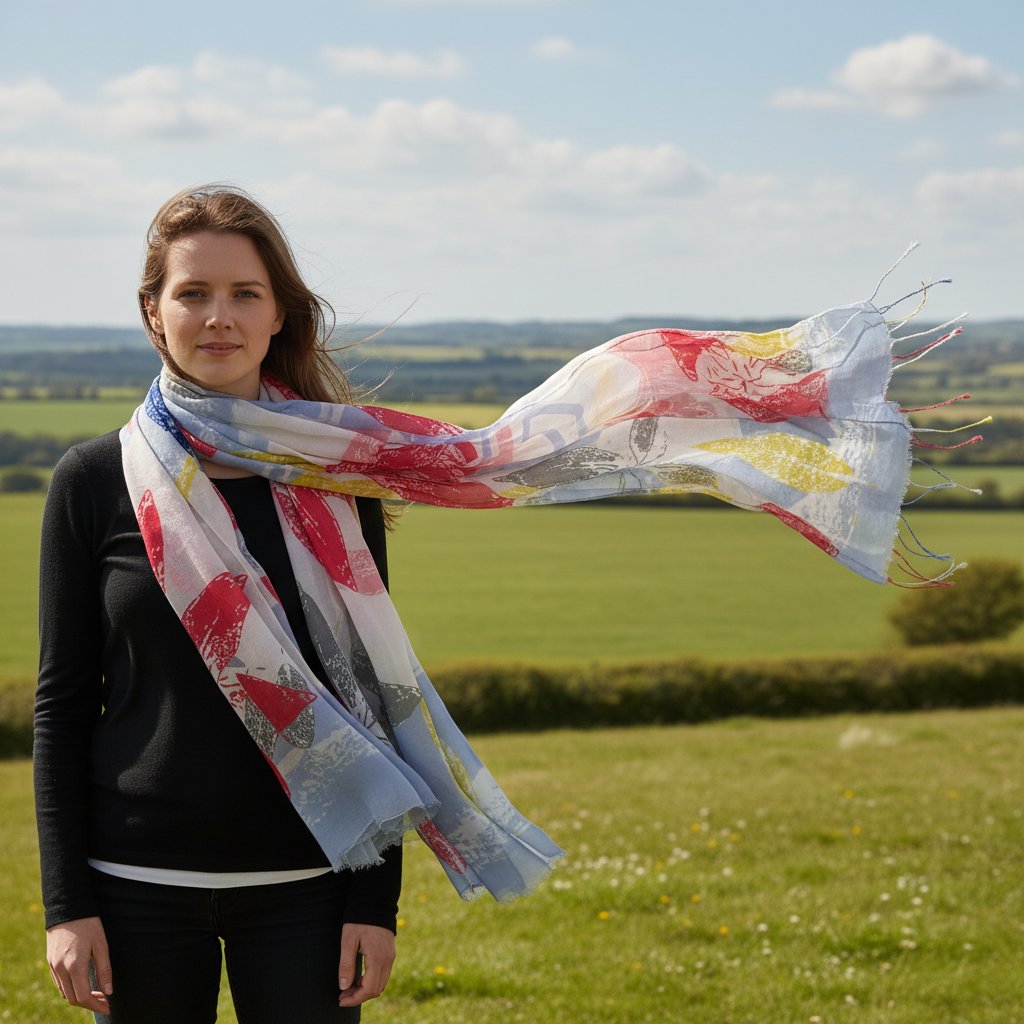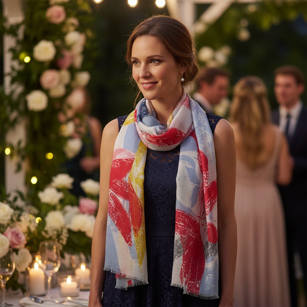 Rozměry šátku 180 × 90 cm umožňují různé způsoby nošení. Uvázejte ho kolem krku, přehodte přes ramena nebo použijte jako módní doplněk. Pestrobarevný vzor