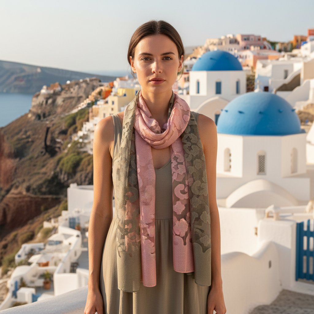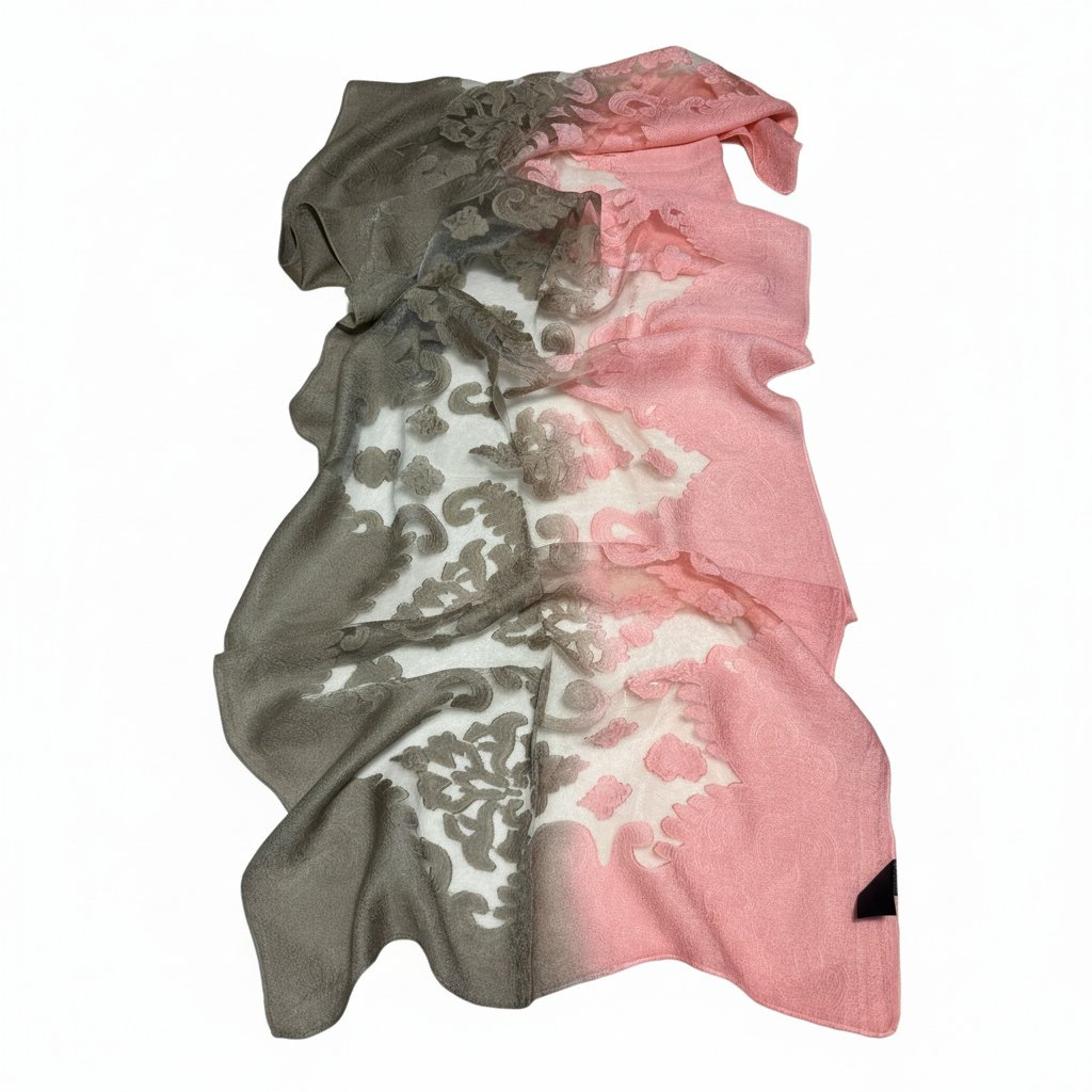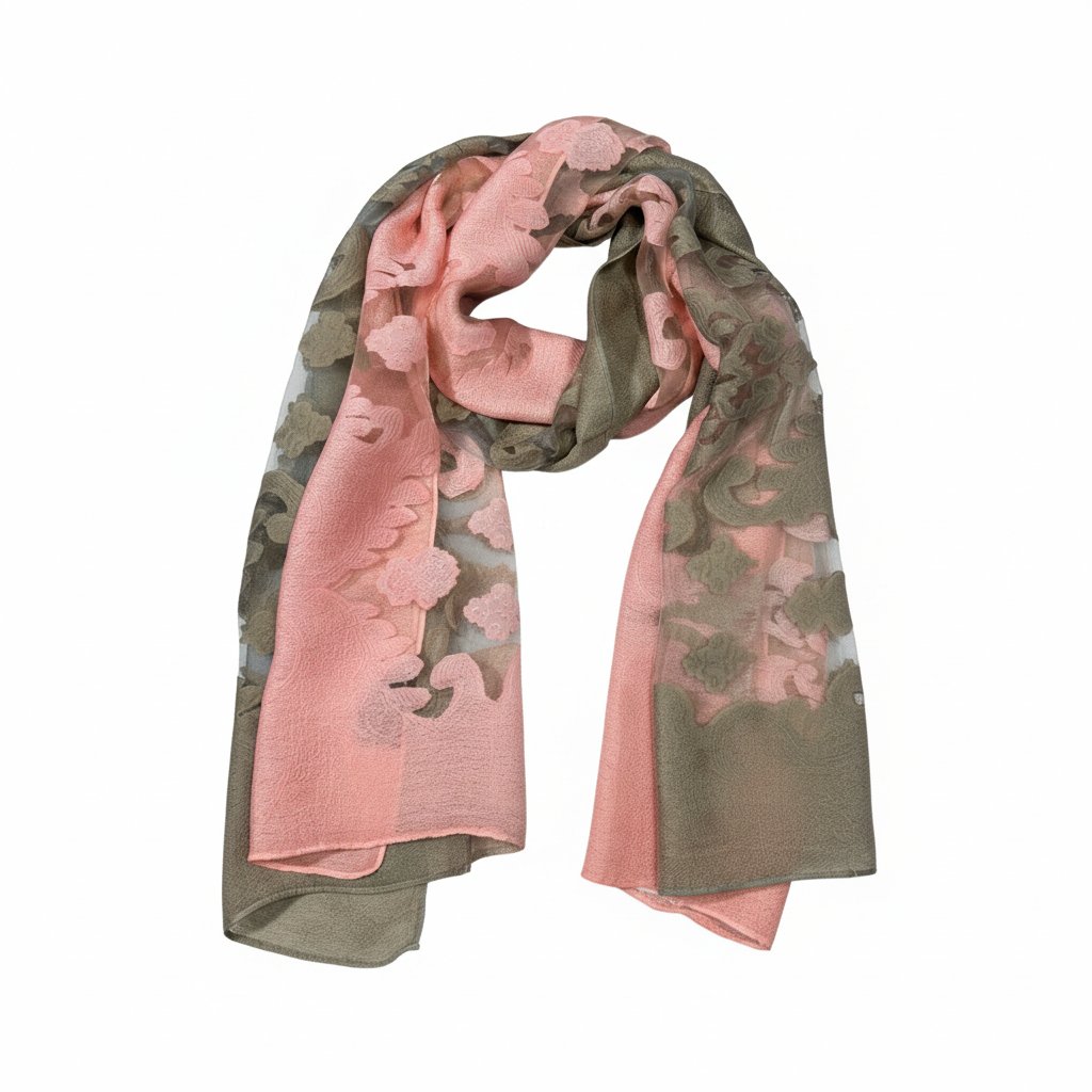 Šátek je vyroben z 85% hedvábí a 15% viskózy, což zajišťuje jemnost a lesk.