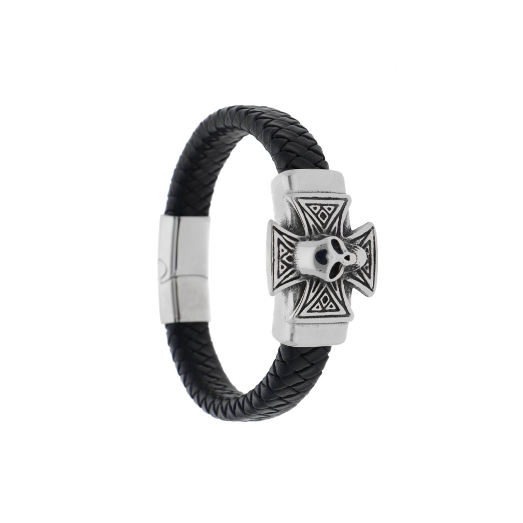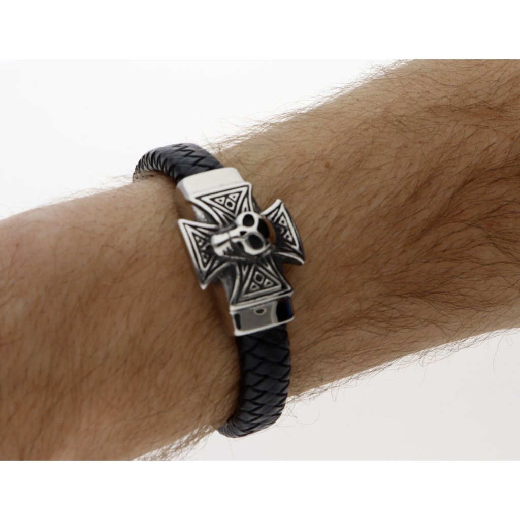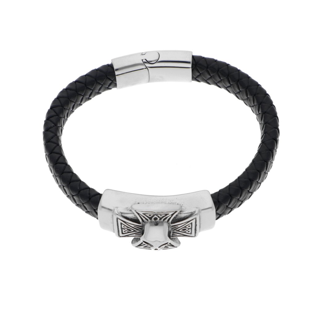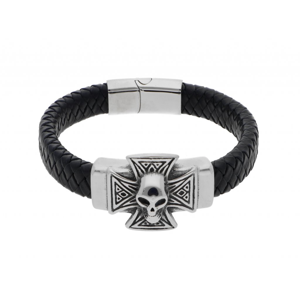 Náramek maltézský kříž pletený černý z kůže a stříbrné oceli + dárkové balení