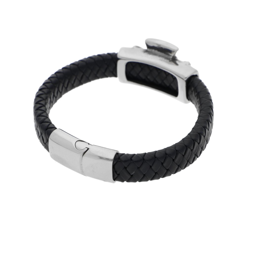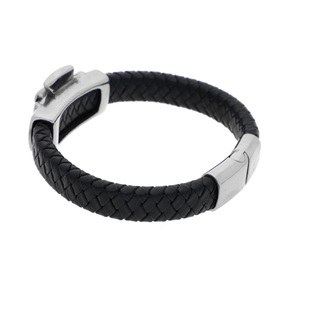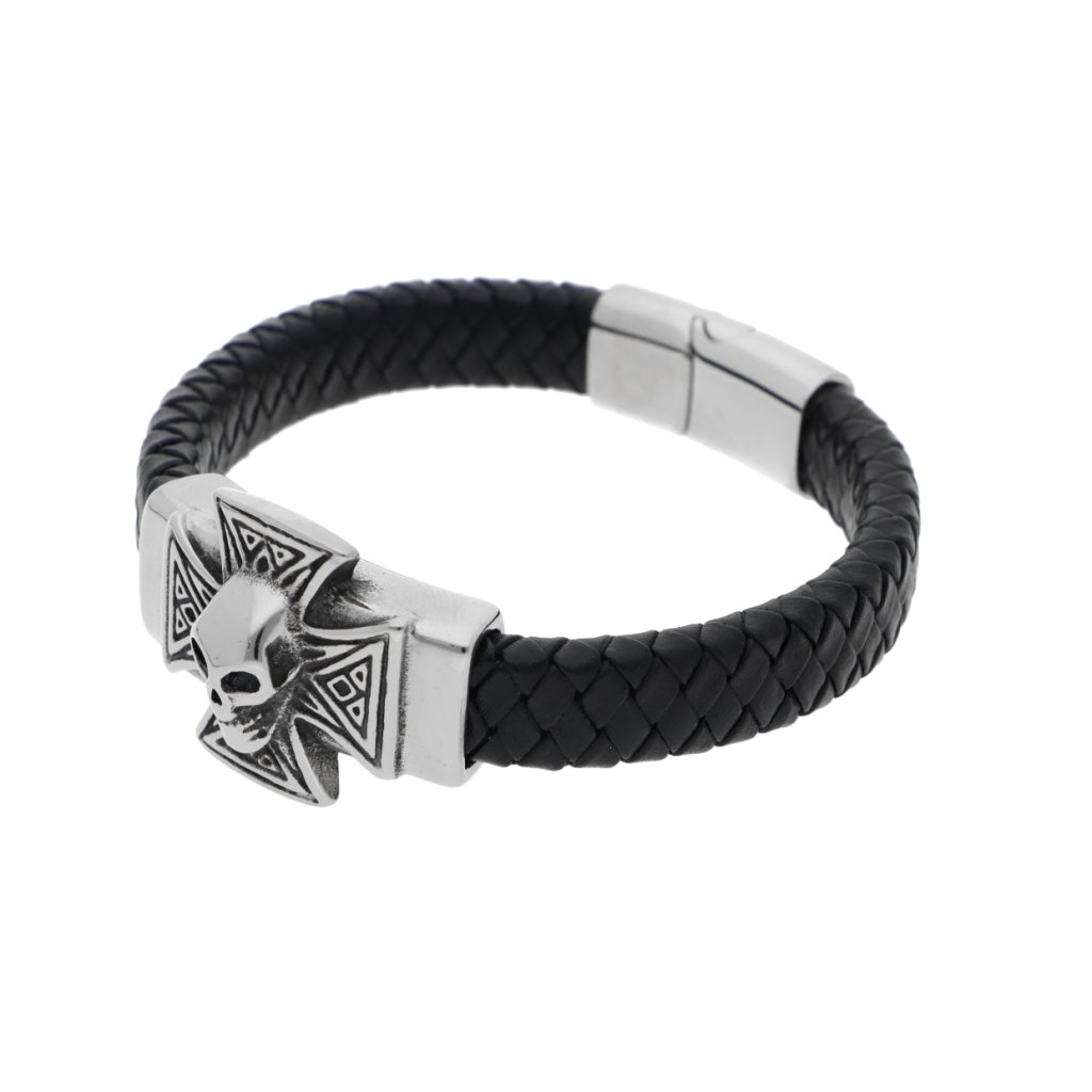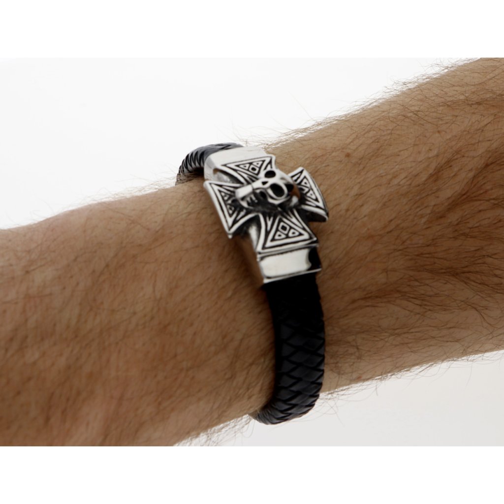 Náramek maltézský kříž pletený černý z kůže a stříbrné oceli + dárkové balení