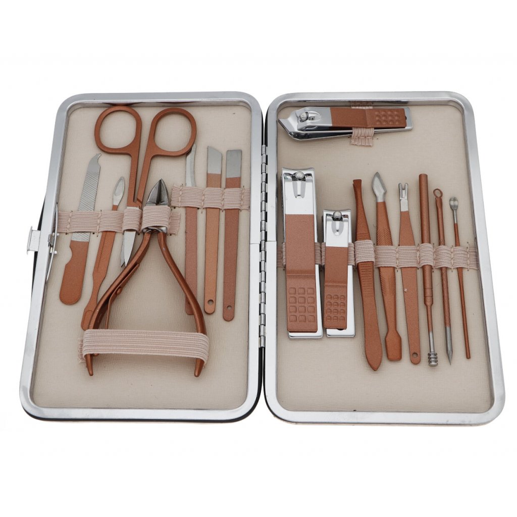 Manikúra obsahuje nůžky, 3ks kleštiček, pinzetu, odstraňovač kůžičky a pilník, manikúrní nástroje na zatlačování kůžičku/čištění nehtů, nůžky. Rozměry manikúry jsou 95 x 160mm. Obal manikúry: umělá kůže,polyester.