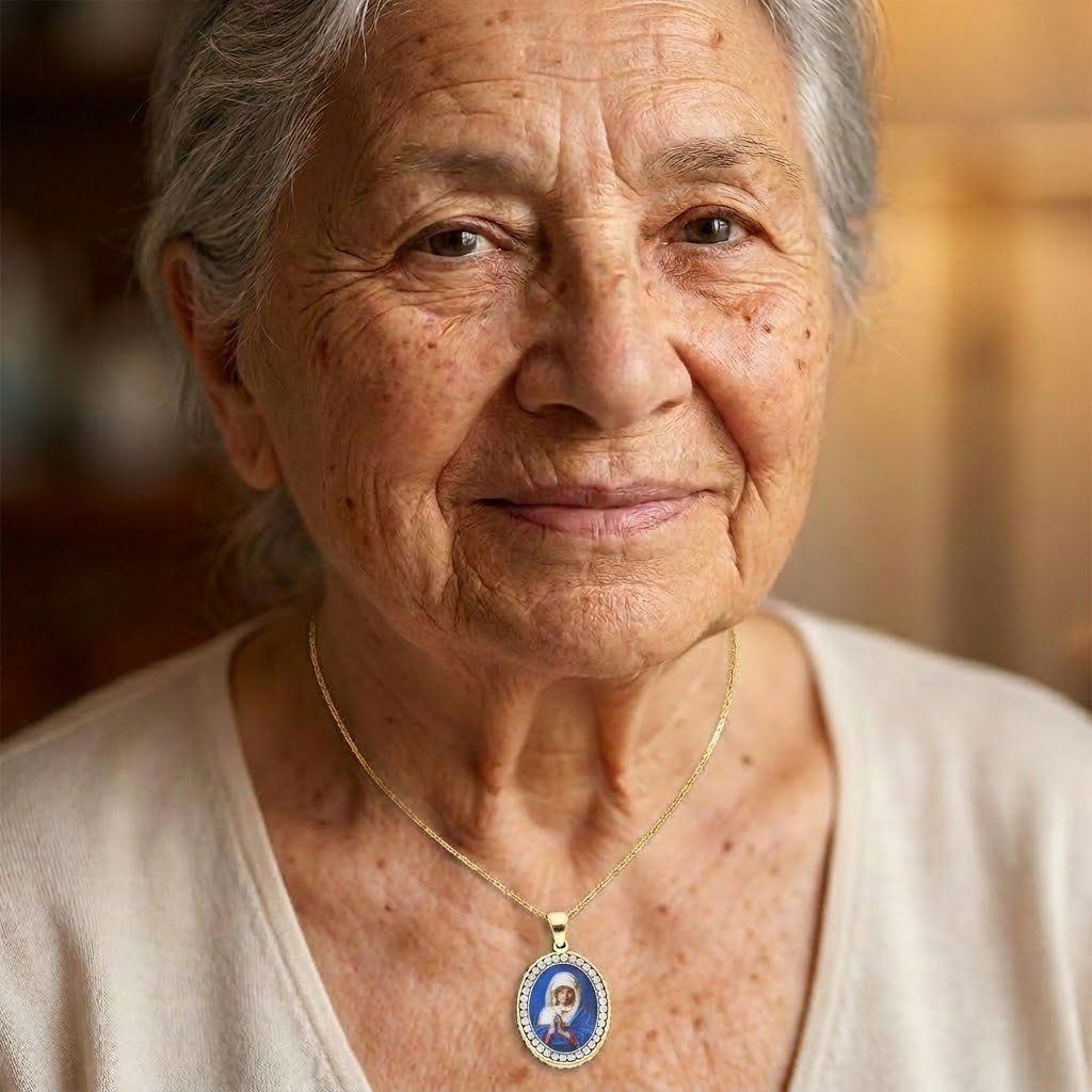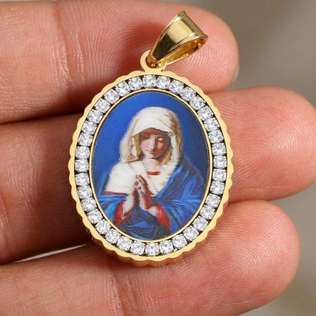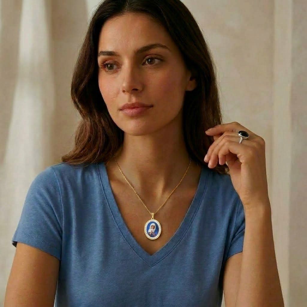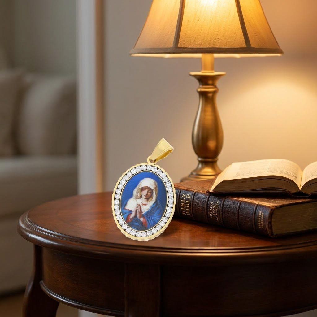 Hlavním motivem přívěsku je Panna Marie, symbol duchovní ochrany a víry.