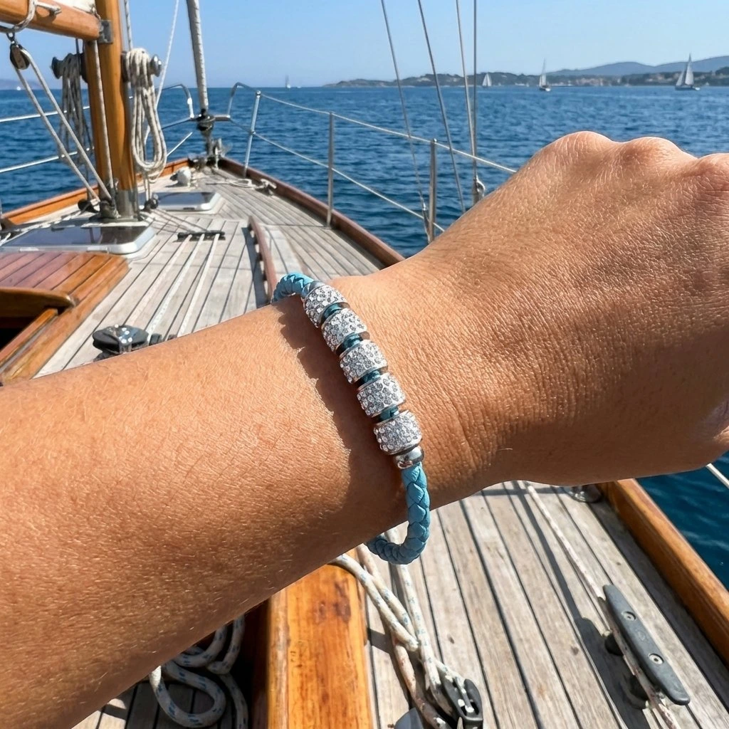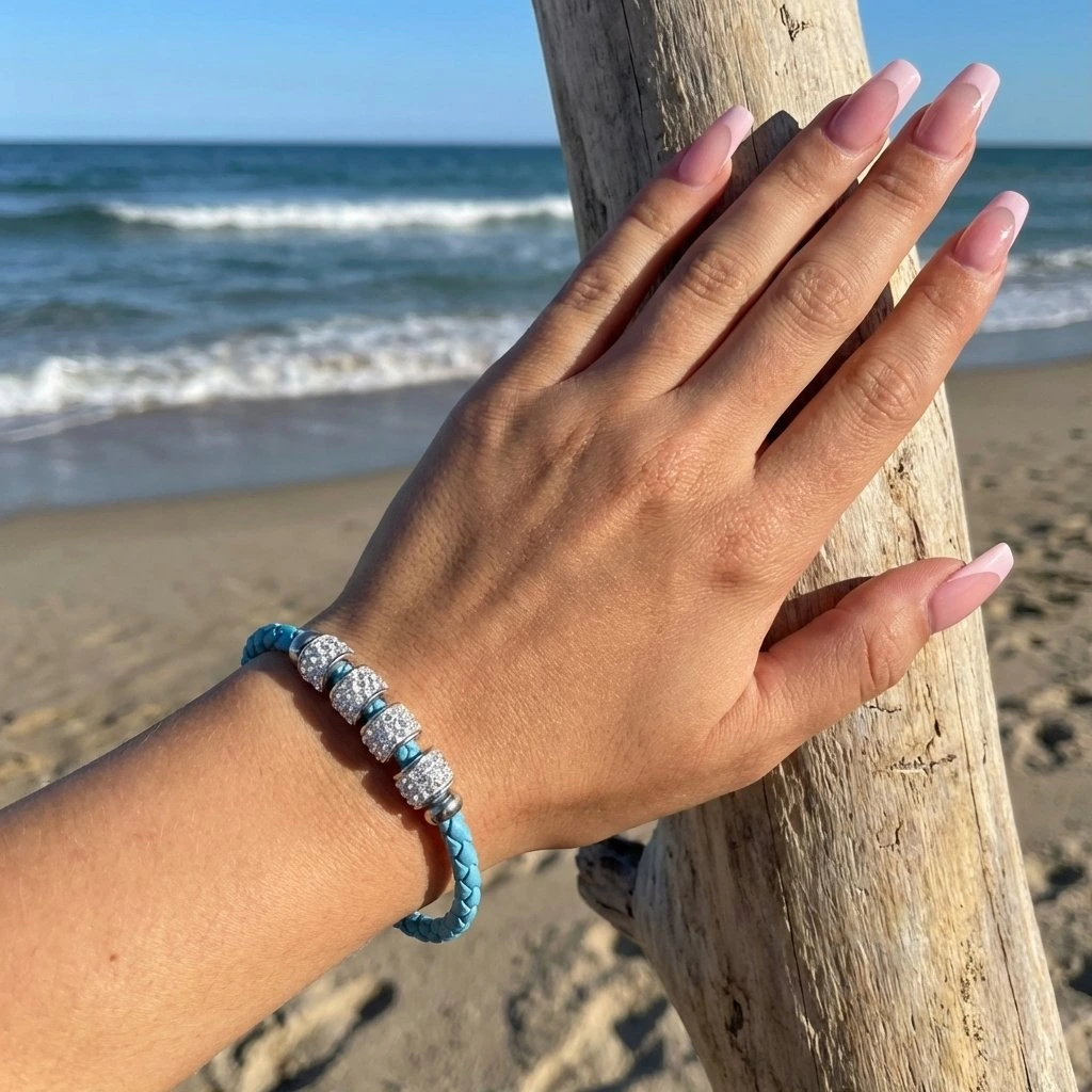 Elegantní dámský náramek trinidad v tyrkysovém provedení s magnetickým zapínáním. Vyroben z chirurgické oceli a eco kůže s detaily ze zirkonů. Ideální doplněk pro každou příležitost.