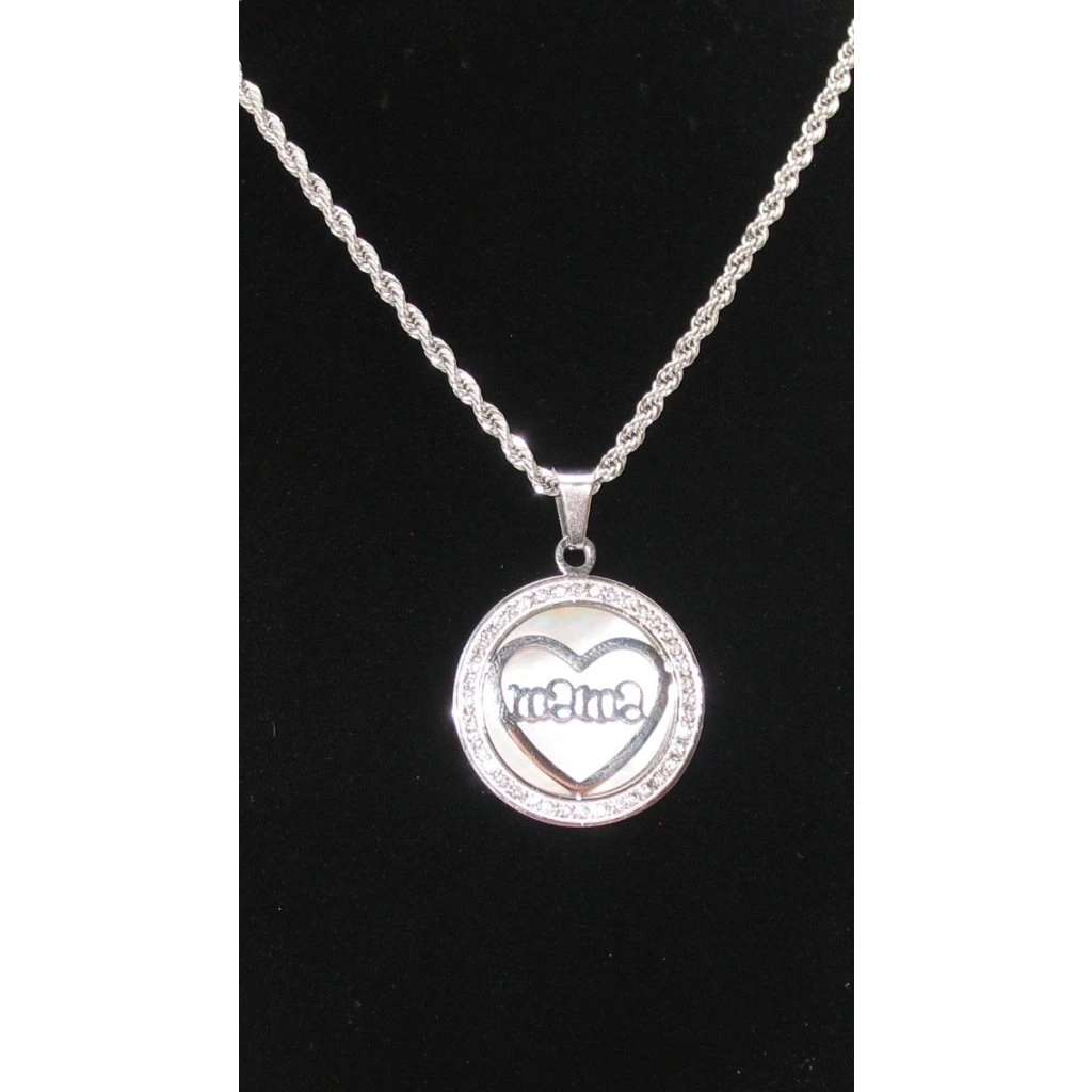 přívěsek je vyplněn perletí ocelovým srdcem a textem mama