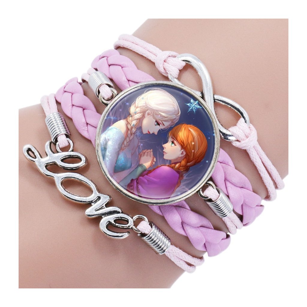 Krásný pletený náramek s kovovým zapínáním a medailonkem s motivy Frozen udělá radost nejedné parádnici a fanynce animované pohádky Ledové království (Frozen).