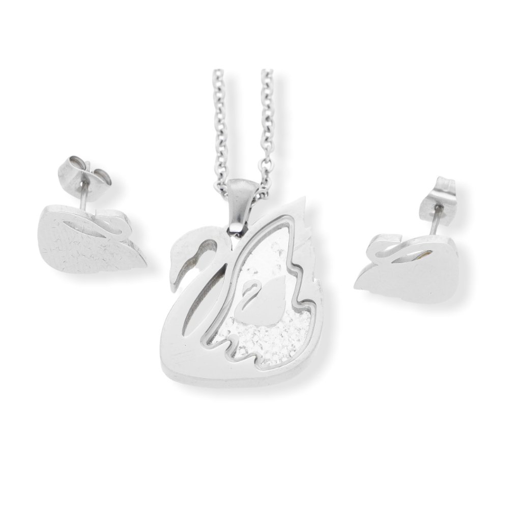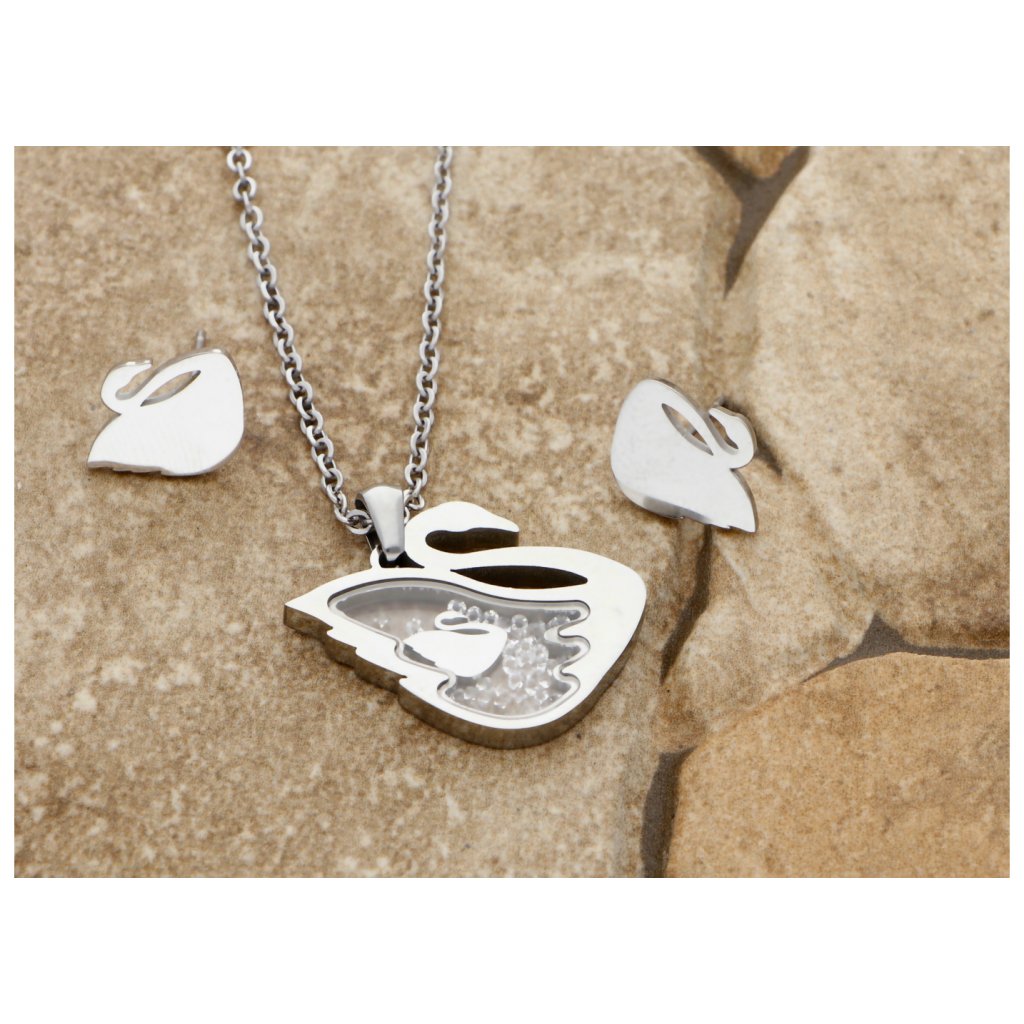 Ocelový přívěsek má stříbrnou barvu. Její povrch je zrcadlově lesklý a hladký. Labuť ma střed těla vyplněný skleněným pouzdrem ve kterém je malinká labuť a drobné kamínky ,které se volně přesipávají . Tento šperk si opravdu zamilujete.