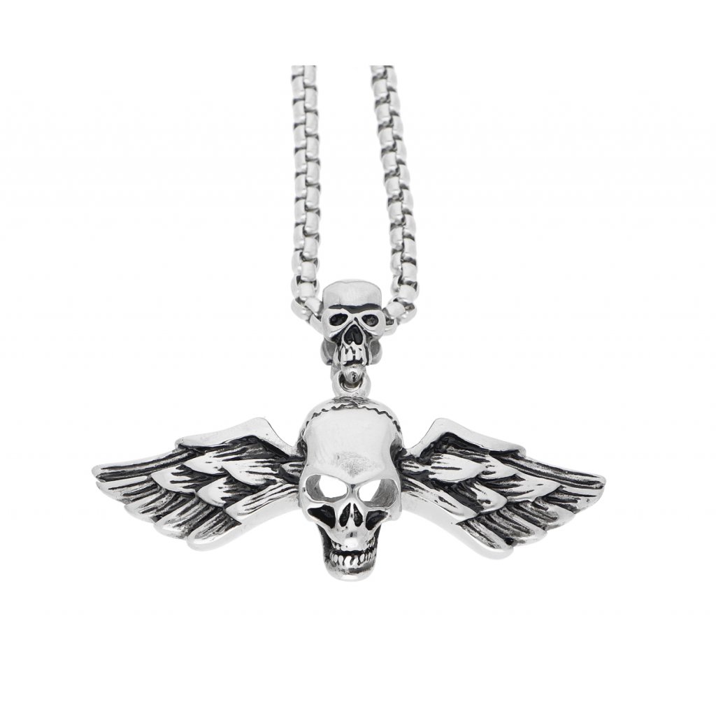 Řetízek s přívěskem lebka. Rozměry přívěsek 6,5 x 2,5 tloušťka 1,5 cm, řetízek délka 60 cm. Tloušťka 0,3 cm. Materiál chirurgická ocel.