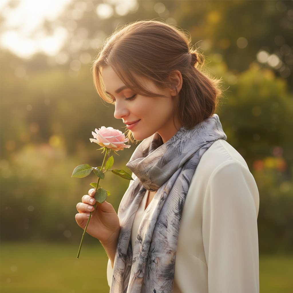 Šátek je vyroben z materiálu se 100% hedvábným pocitovým složením, který je měkký a příjemný na dotek.