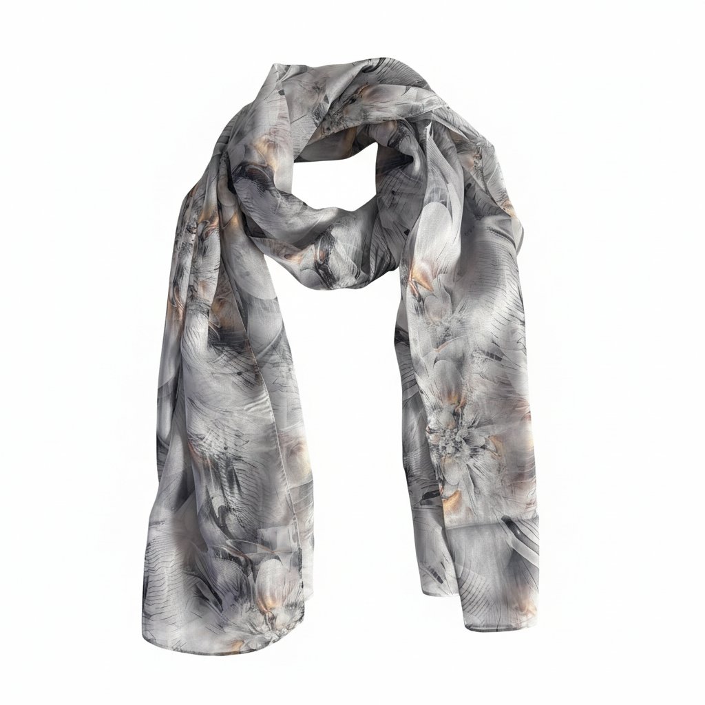 Šátek je v odstínech šedé, světle hnědé a šedo hnědé, což z něj činí univerzální doplněk.