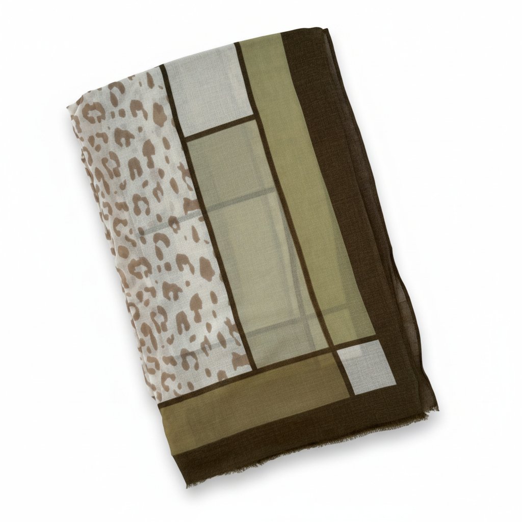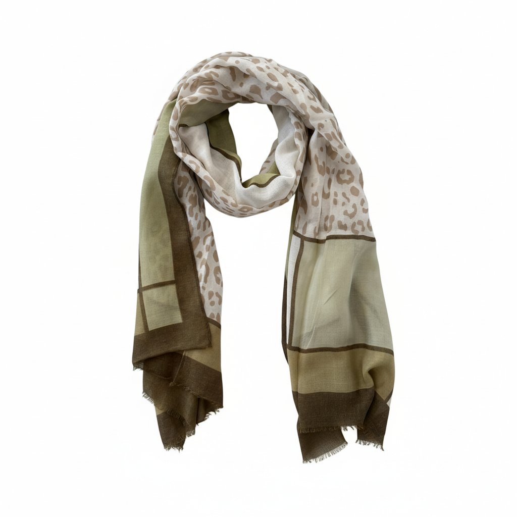 Šátek je dostupný v zelené, béžové, hnědé a světle hnědé barvě.