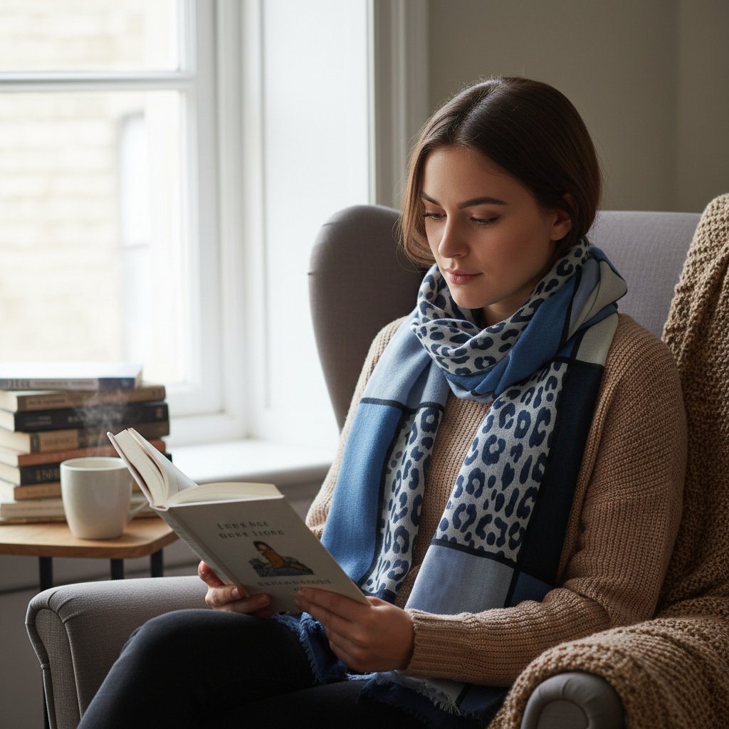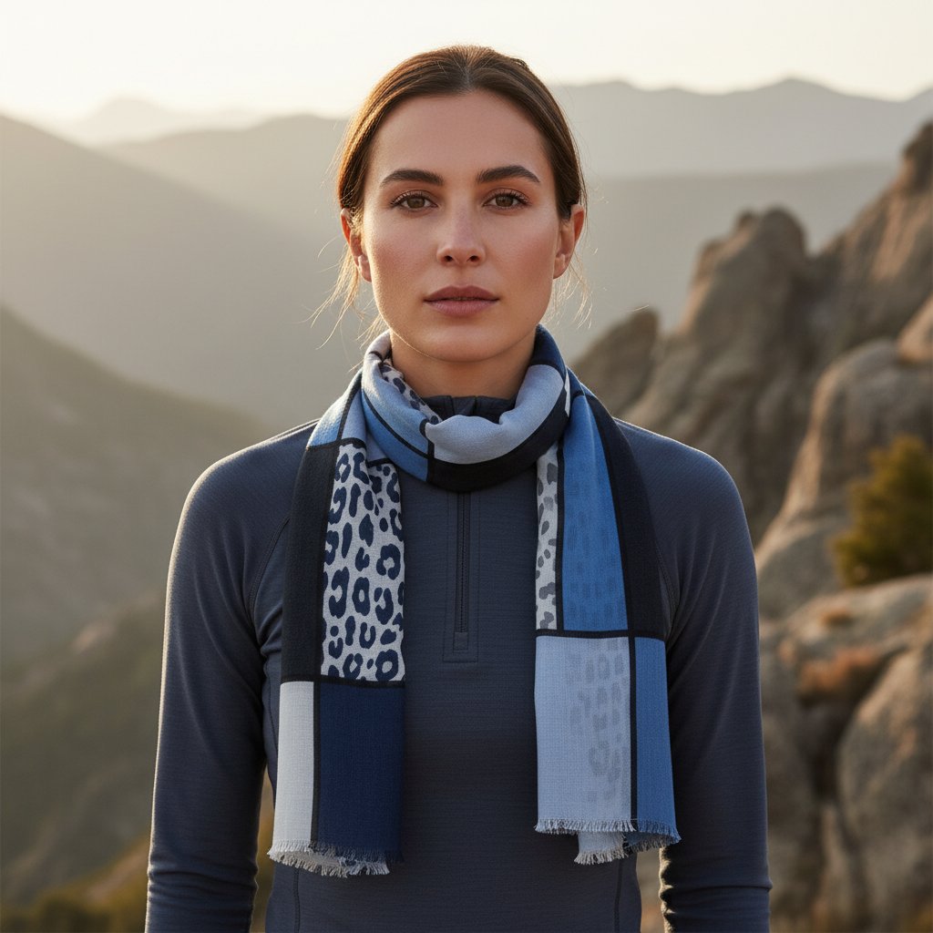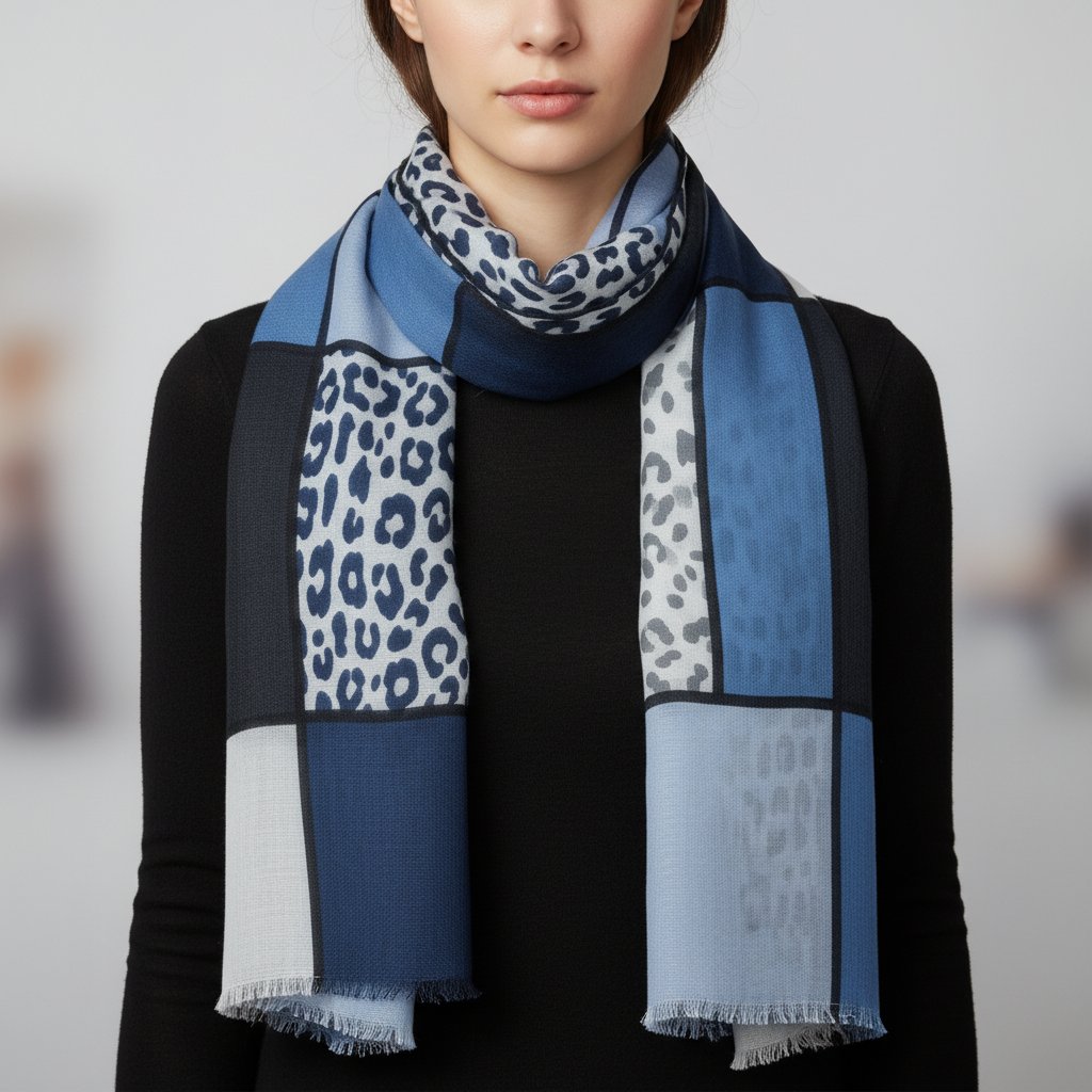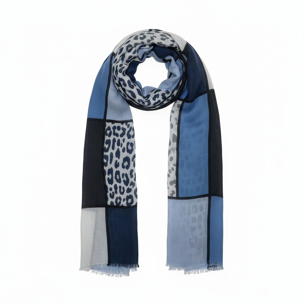 Pestrý výběr barev jako béžová, tmavá modrá a šedá zajišťuje, že šátek snadno ladí s různými outfity. Vhodný pro každou příležitost