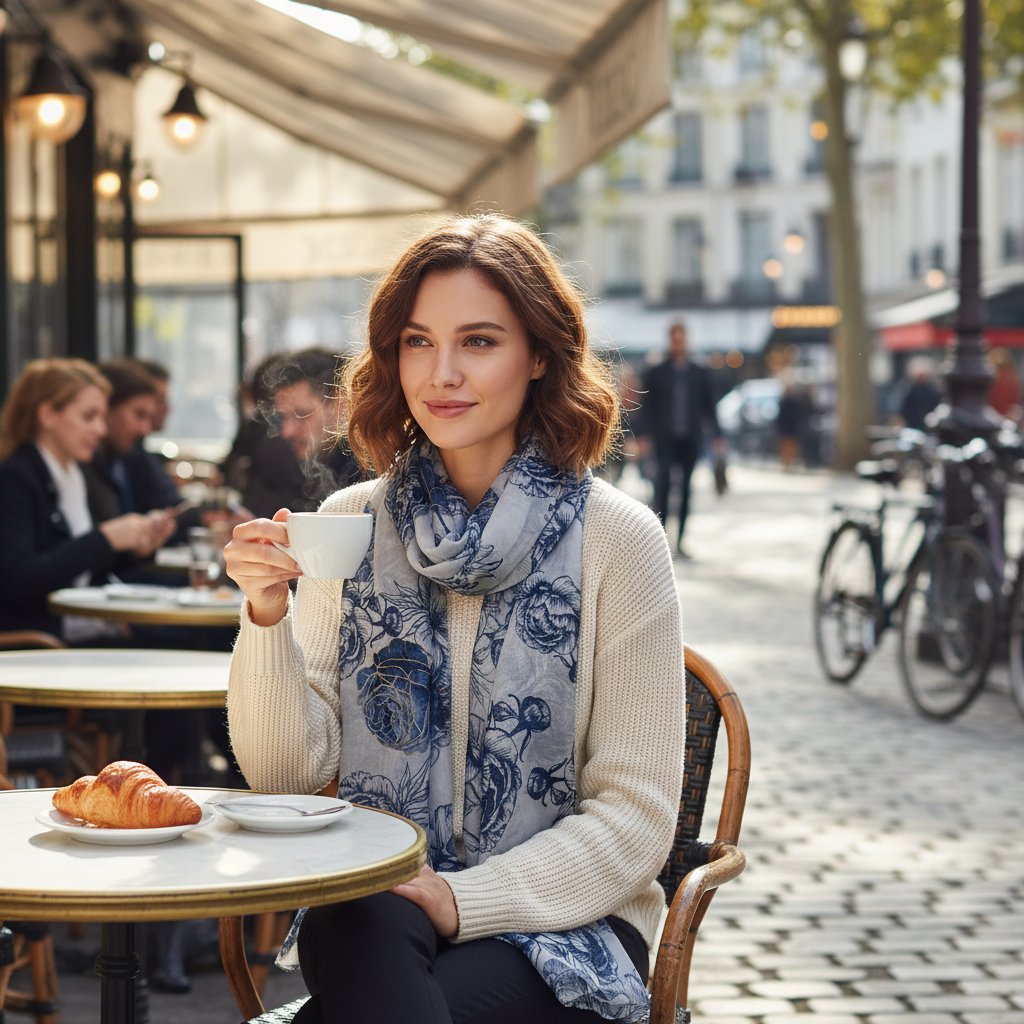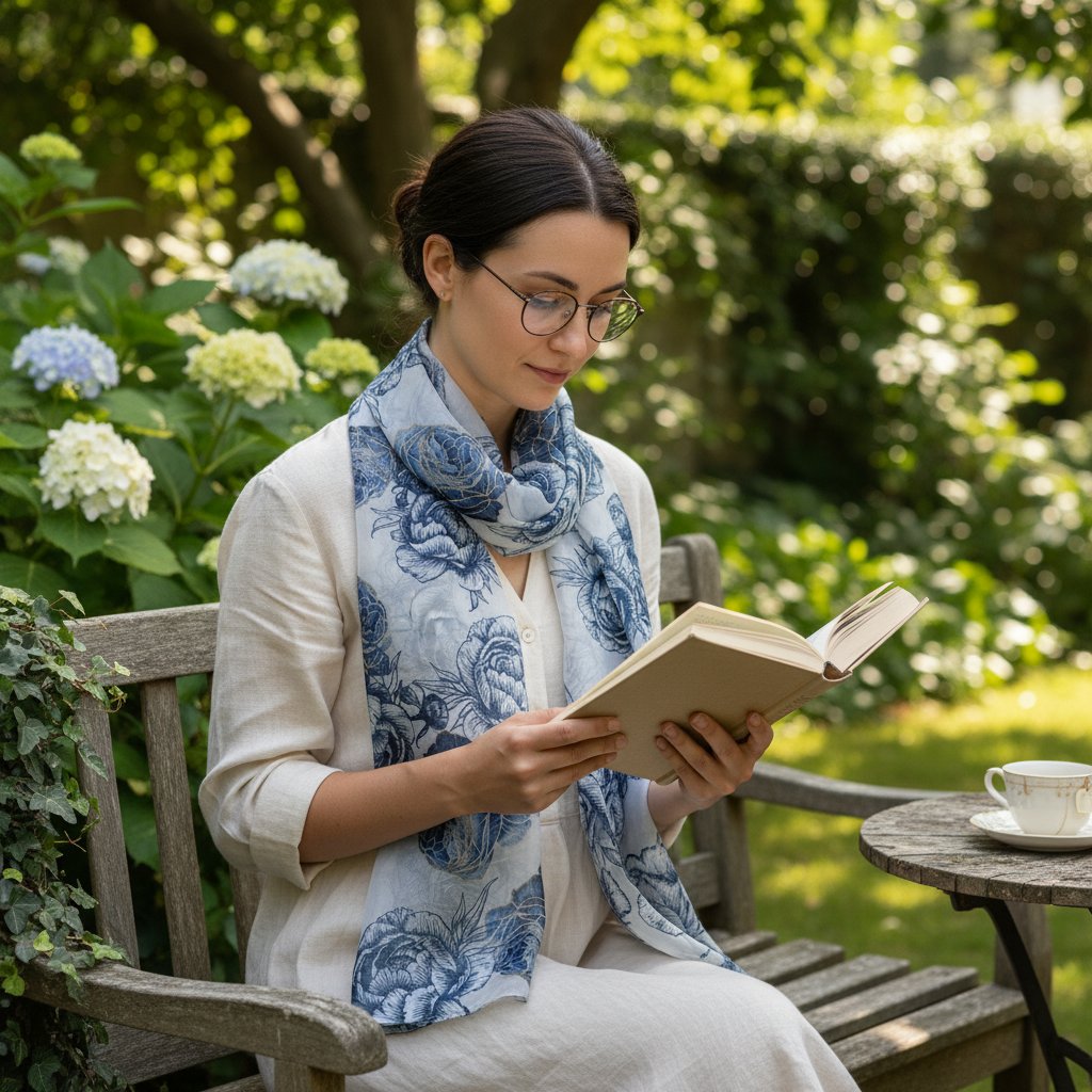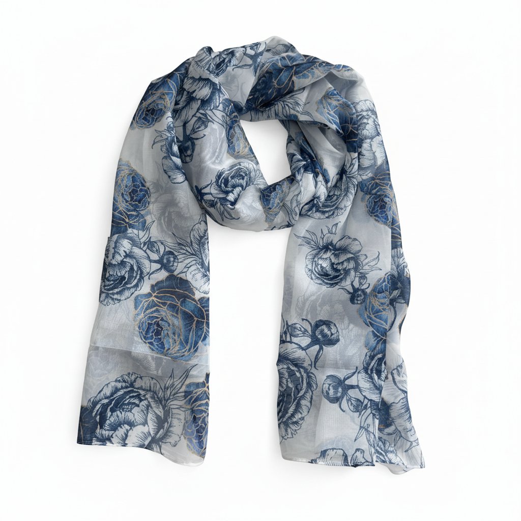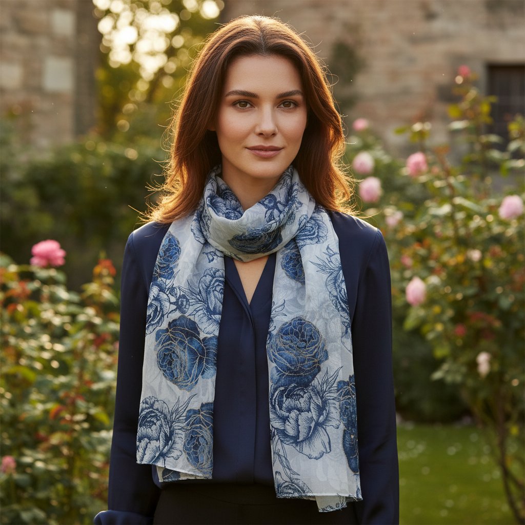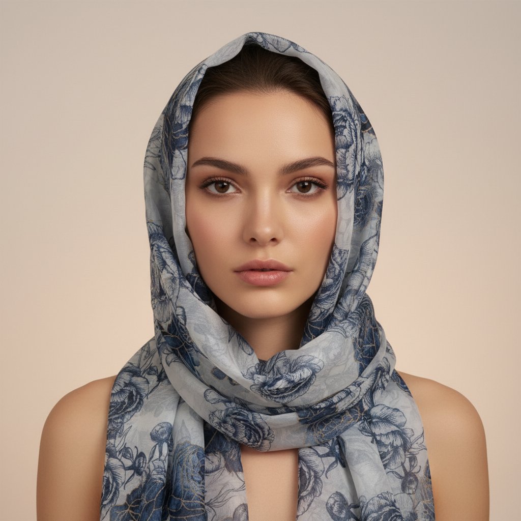 Šátek lze nosit mnoha způsoby, od stylového uvázání na krk po elegantní přehoz přes ramena. Květinový design